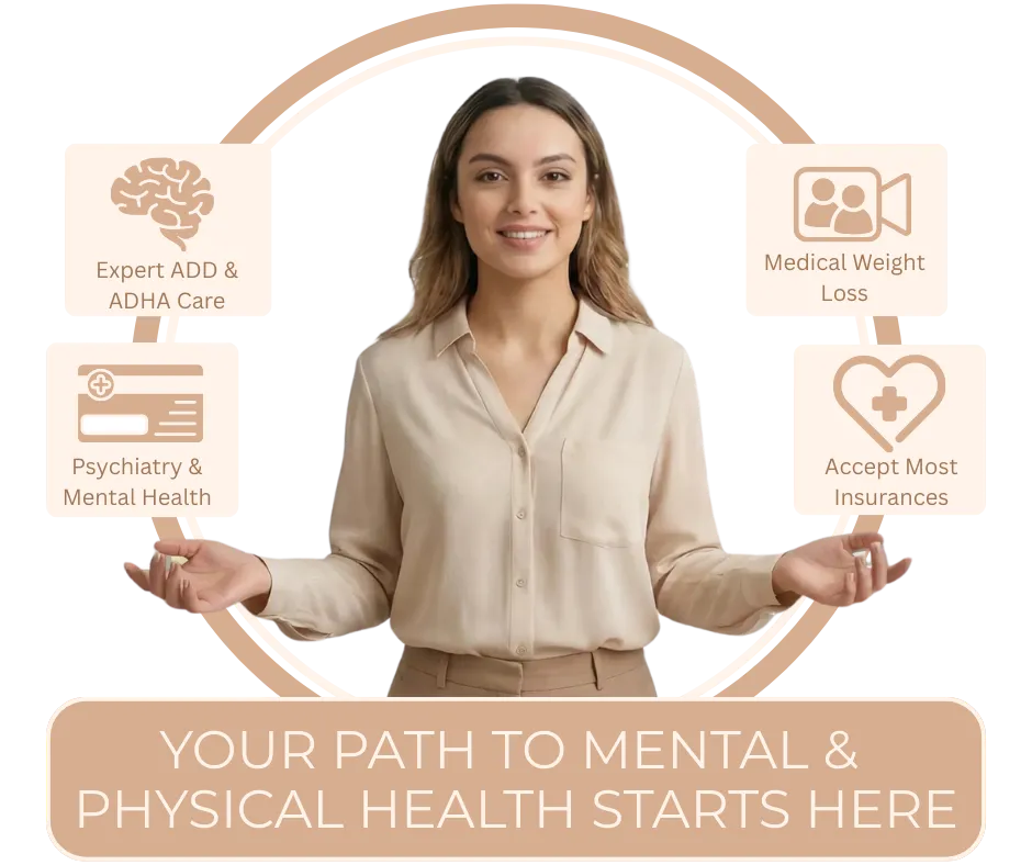 We offer whole-person care that brings together mental health (psychiatry), medical weight loss, and telehealth services in one integrated system. Our goal is to treat the whole person, not just individual symptoms.